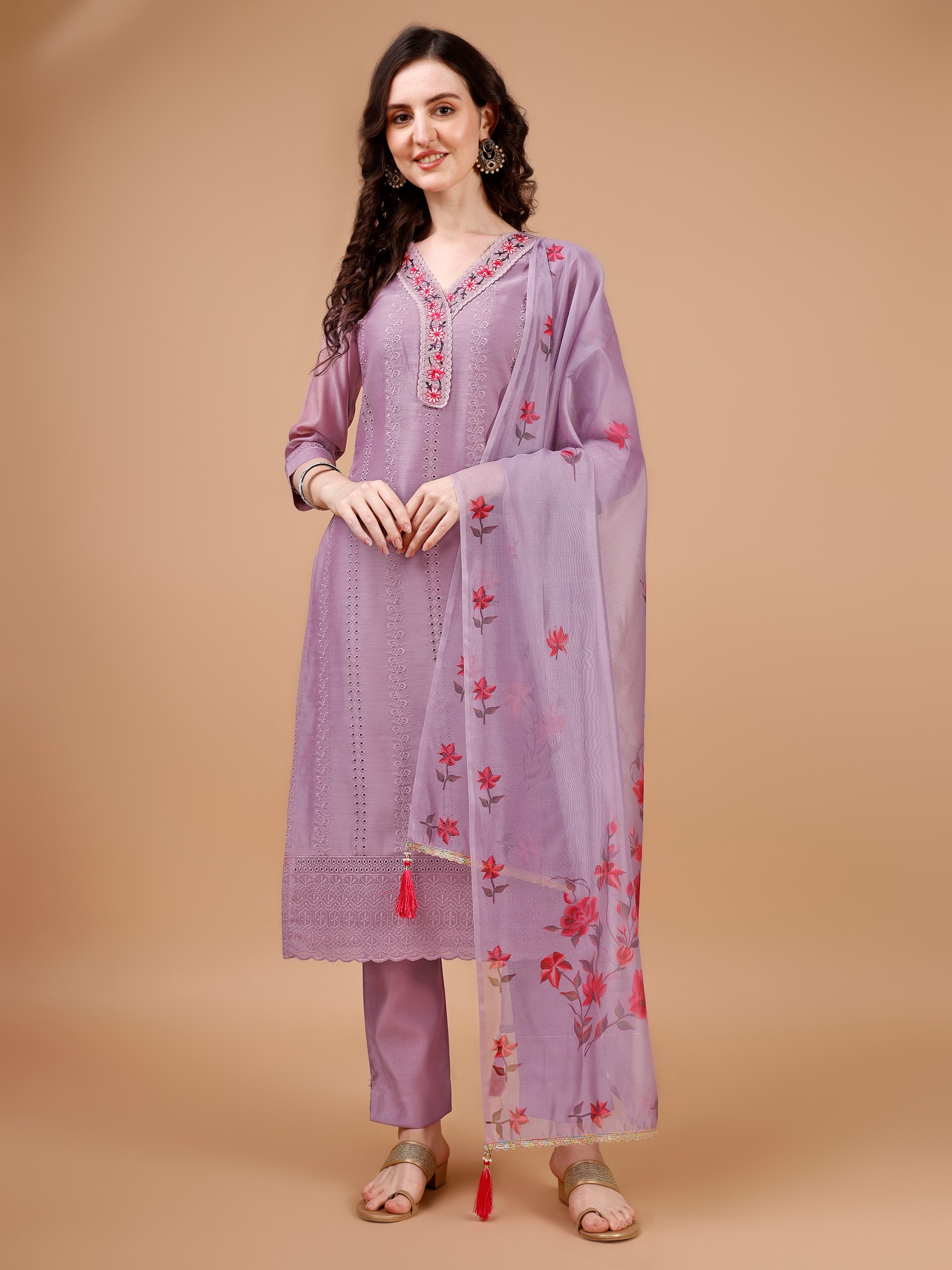 This Lavender Kurta Suit Set Is a Perfect Mix Of Edgy And Elegant. Adorned From Chanderi Silk On It Has Embroidery Placket Along With V Neckline, Bored Schiffli Embroidery All Over And Three Quarter Sleeves. It Comes With Solid Lavender Pure Viscose Pant Which Has Partially Elasticated Waistband And A Pocket For Maximum Comfort And Same Coloured Floral Printed Organza Dupatta Of Laced Hemline. A Lavender And Purple Set Can Be Your Ultimate Ensemble For Comforting Glamour.