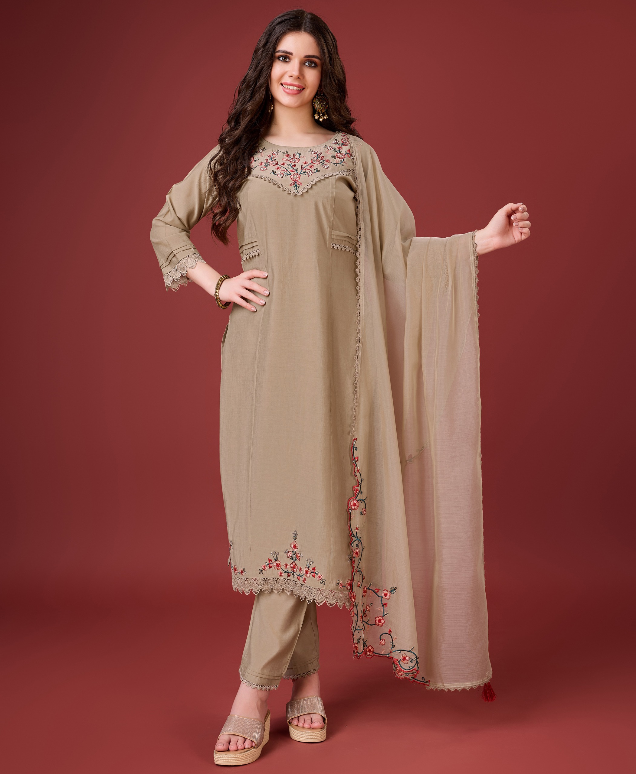 - Style:- Kurta Length: 46 Inch; Pant Length: 39 Inch; Dupatta Length: 2.25 mtr | Pattern: Embroidered | Occasion: Festive & Party | Ornamentation: Pearls & Beads |Sleeve Type: 3/4th Regular Sleeves | Color: Bronze