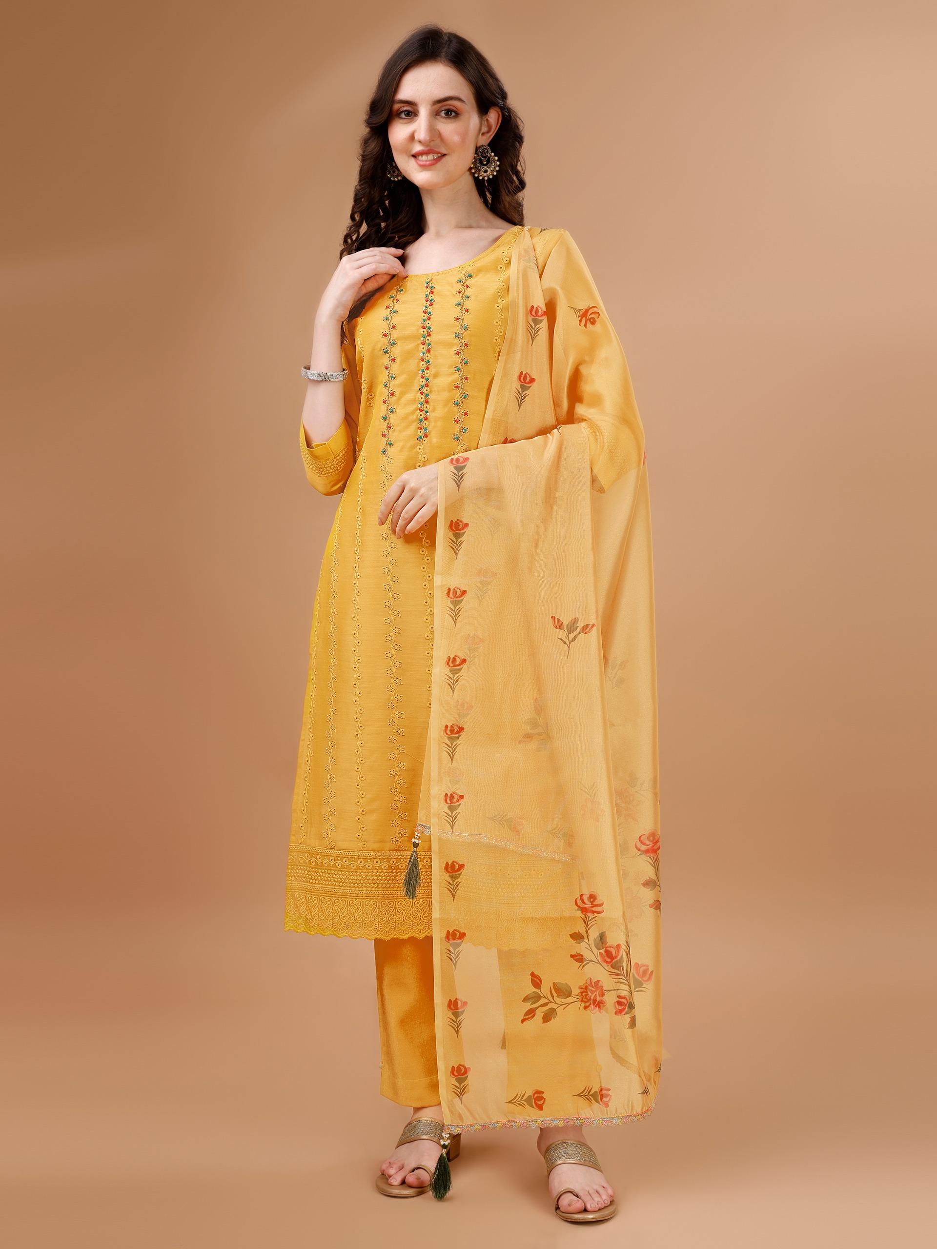 Yellow & Red Woven Design Kurta with Trousers & Dupatta